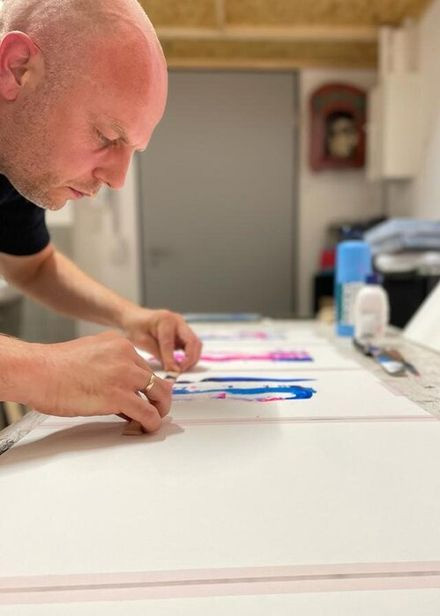 A self-taught artist, Artmann developed his highly rigorous technique—an almost meditative process of layering and repetition—to establish a foundation of mastery. From this precision, he introduces an element of radical surrender, allowing raw, unscripted compositions to emerge. The deliberate, restricted palette of fluorescent pink and phthalo blue serves as a visual metaphor for finding inner peace: true liberation is found not by escaping the struggle, but by mastering it.